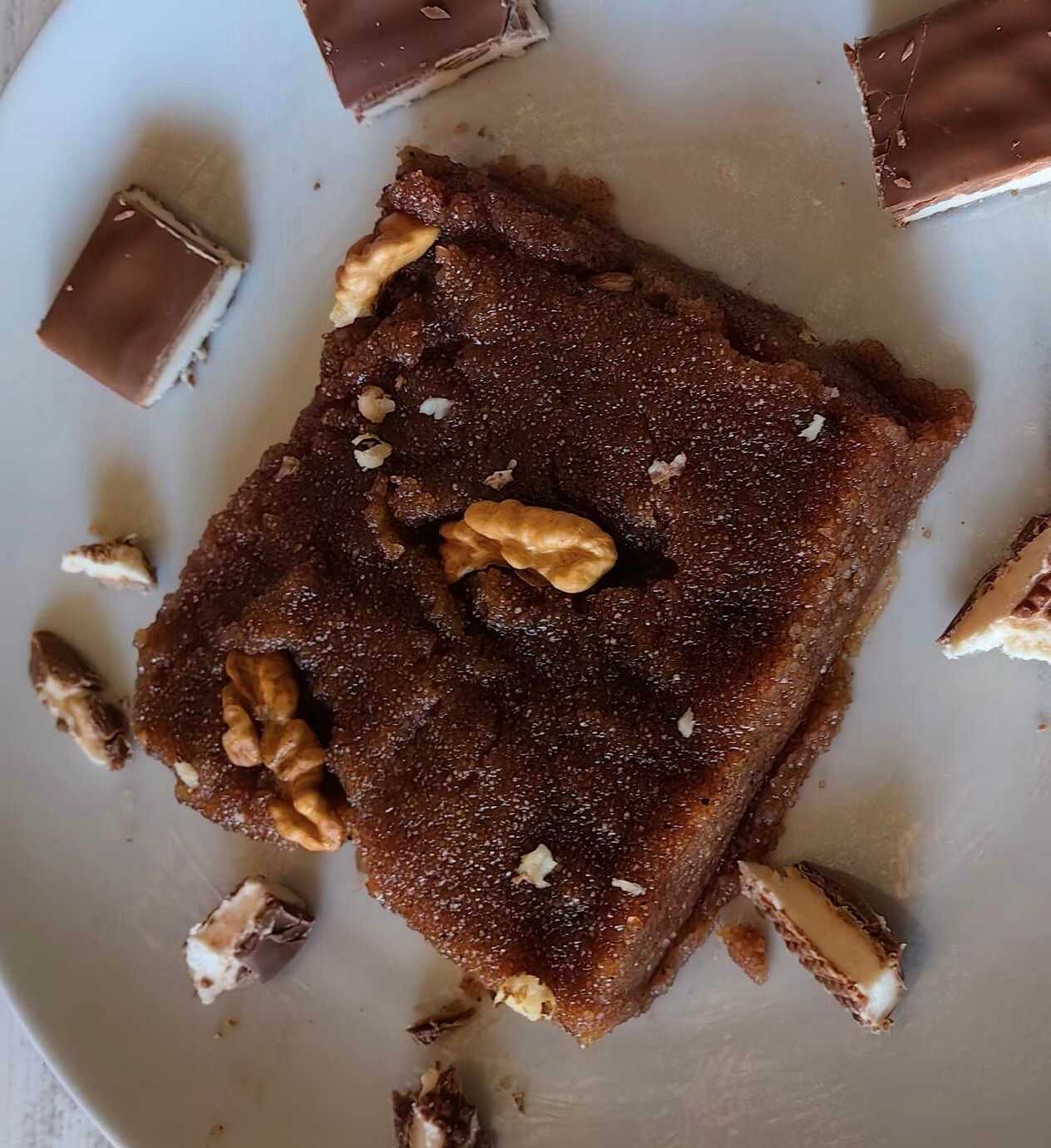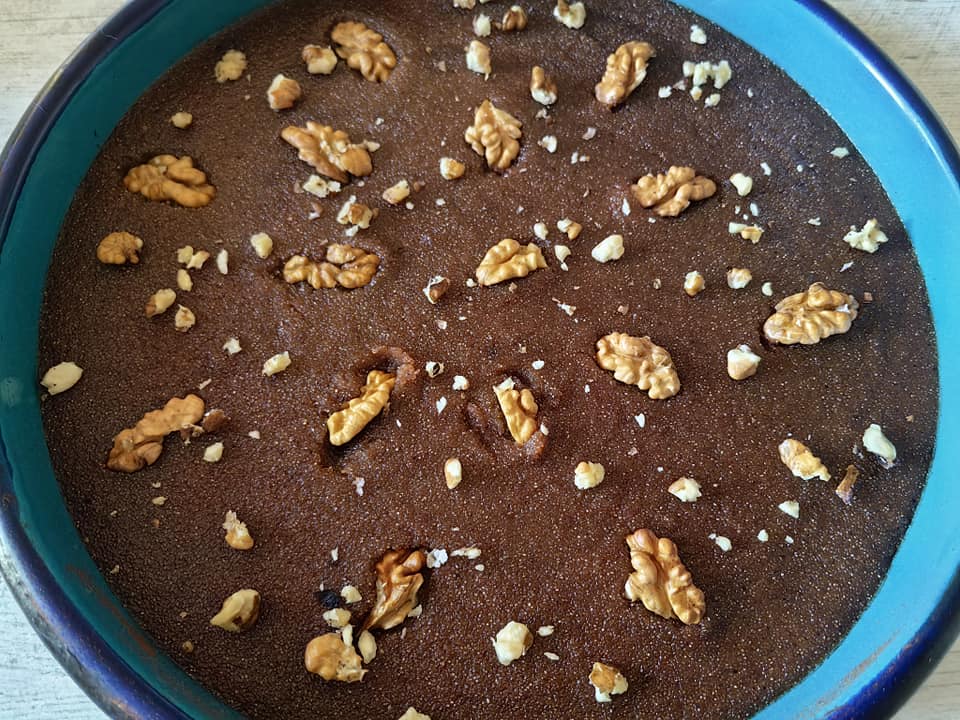 Το έτοιμο μείγμα χύνεται στο ταψί, διαμέτρου περίπου 28 εκ. Μπορείτε επίσης να χρησιμοποιήσετε φορμάκια σιλικόνης. Από πάνω τακτοποιώ ωμά καρύδια και αν τα καβουρδίσετε σε στεγνό τηγάνι, θα κάνετε το γλυκό τρελά αρωματικό και νόστιμο.