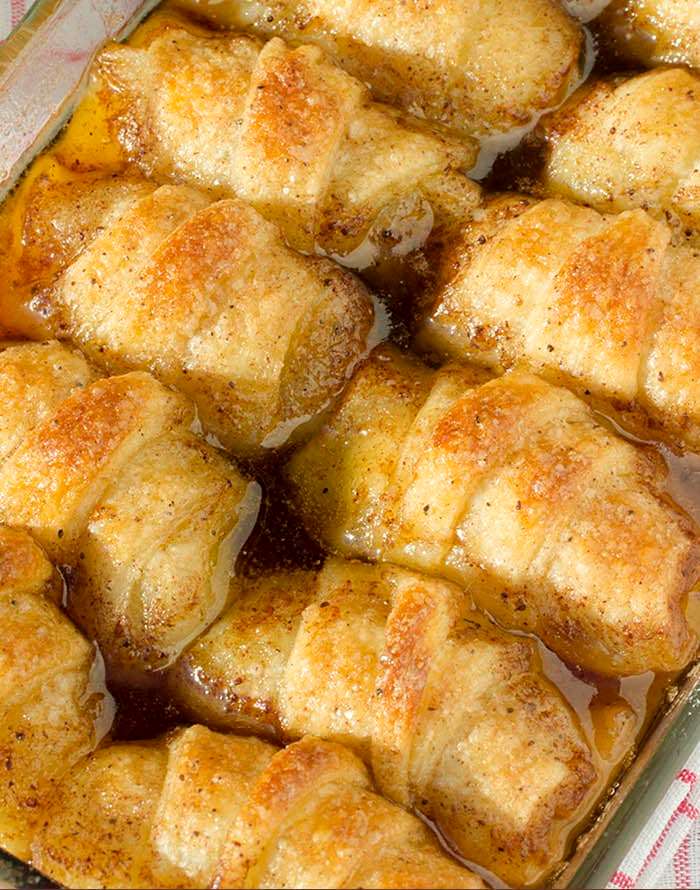 Λιώστε το βούτυρο σε ένα κατσαρολάκι, ανακατεύουμε τη ζάχαρη, τη βανίλια και την κανέλα, και όταν δέσει το σιρόπι, βγάζουμε από τη φωτιά και ρίξτε το στις ζυμές με τα μήλα.