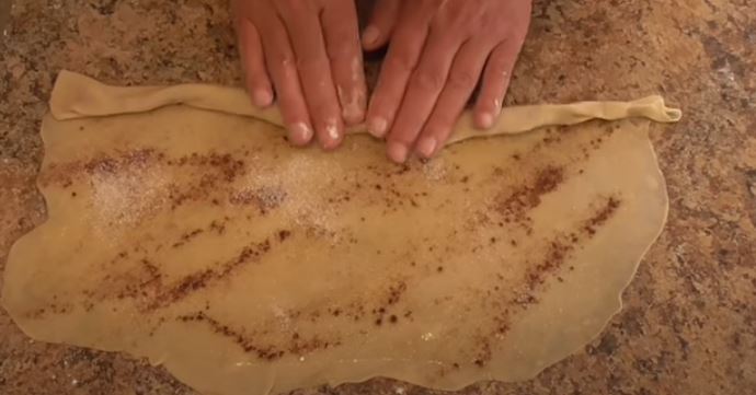 Το βουρτσίζουμε με βουτυρο όλο το φύλλο. Πασπαλίζουμε με κανέλα και ζάχαρη και τώρα είναι έτοιμο να το τυλίξτε από την μεγάλη άκρη σαν ρολό.