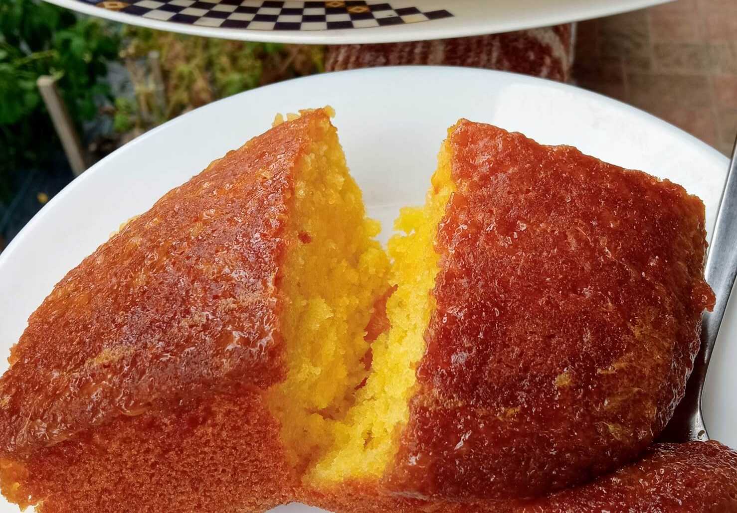 Βράζουμε το σιρόπι για 2 λεπτά ξαφριζοντας το και βγάζουμε το ζεστό κέικ από τον φούρνο,το τρυπάμε παντού με ξυλάκι από ένα σουβλάκι