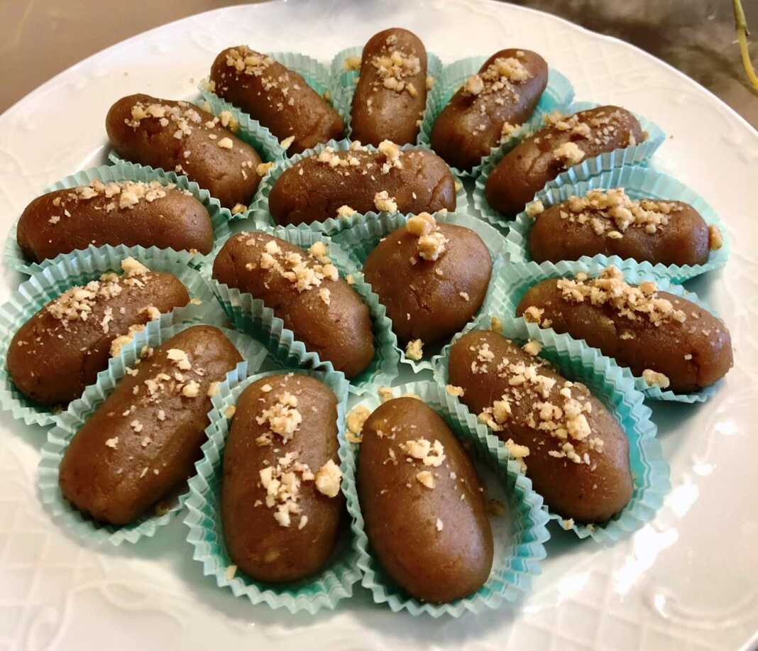 Αφήνουμε το μείγμα να κρυώσει και το πλάθουμε σε μπουκίτσες.Γαρνίρουμε με καρύδια.