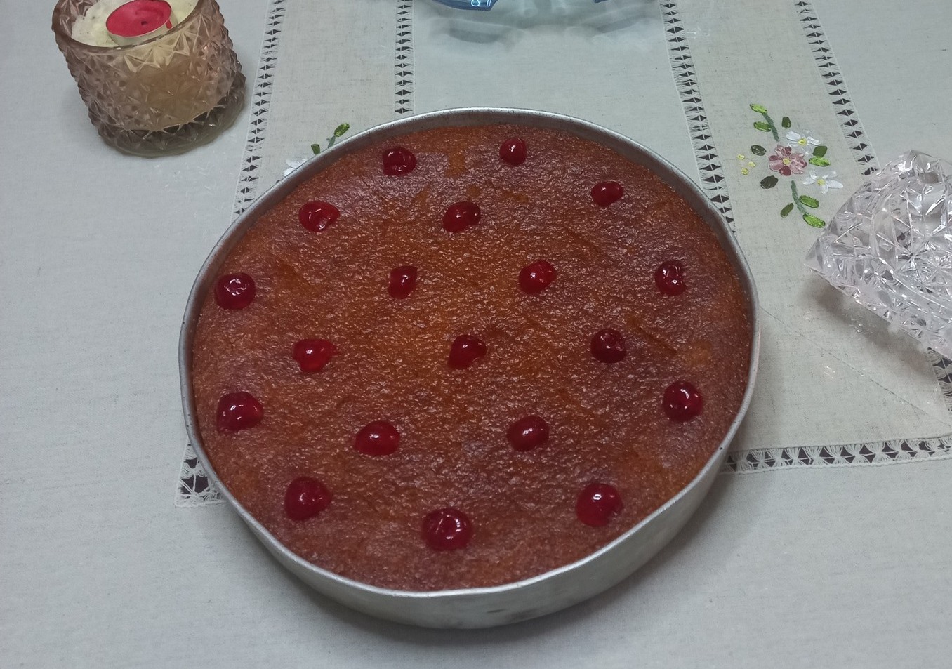 Όταν το κέικ έχει κρυώσει λίγο αλλά είναι ακόμα ζεστό, κάνω τομές με ένα μαχαίρι στην επιφάνειά του για να απορροφήσει καλύτερα το σιρόπι. Έπειτα, με μια κουτάλα ή μία πιπιέρα, ρίχνω σιγά-σιγά το κρύο σιρόπι πάνω στο ζεστό κέικ, αφήνοντάς το να απορροφηθεί πλήρως. Αφήνω το κέικ με καρύδα να ξεκουραστεί για τουλάχιστον 2 ώρες πριν το σερβίρω, ώστε να πάρει όλες τις γεύσεις. Τέλος, το γαρνίρω με γλυκό του κουταλιού κεράσι για μια εντυπωσιακή παρουσίαση.