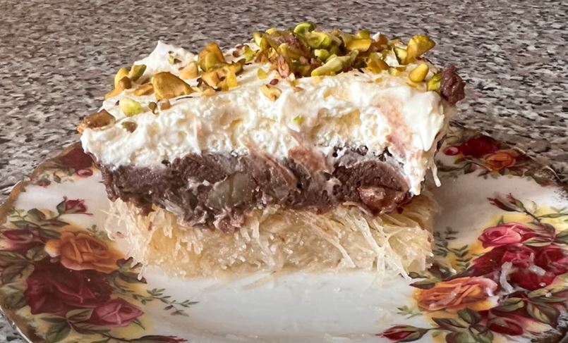 Μόλις το κανταΐφι ροδίσει, ρίξτε από πάνω το κρύο σιρόπι και αφήστε το κανταΐφι να απορροφήσει το σιρόπι για περίπου 30 λεπτά με μία ώρα.