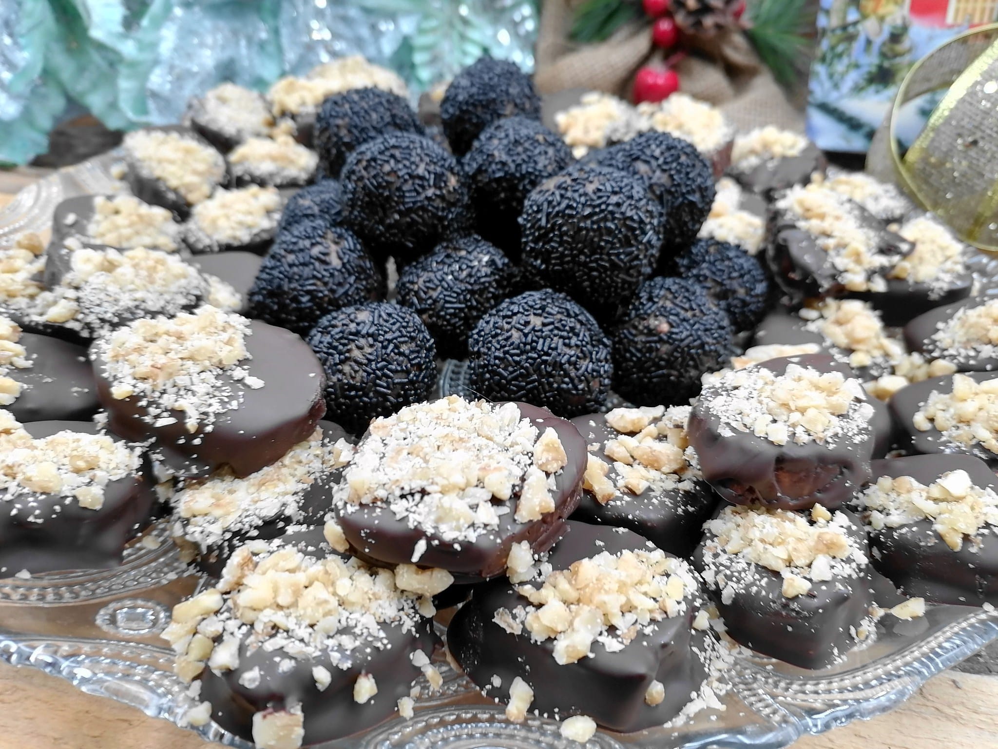 Δίσκος με διάφορα σοκολατένια κεράσματα φτιαγμένα από μελομακάρονα, μερικά καλυμμένα με τρούφα και άλλα με στρώση σοκολάτας και καρύδι.