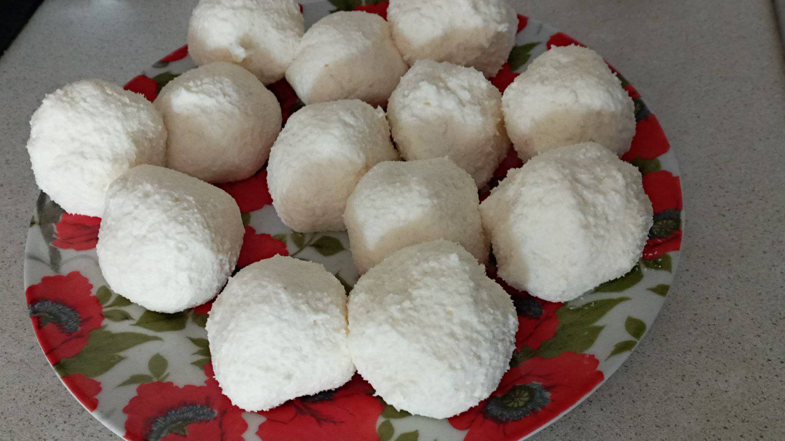 μέχρι να γίνουν λεία. Προσθέτουμε την καρύδα και ανακατεύουμε. Πλάθουμε μικρά μπαλάκια.