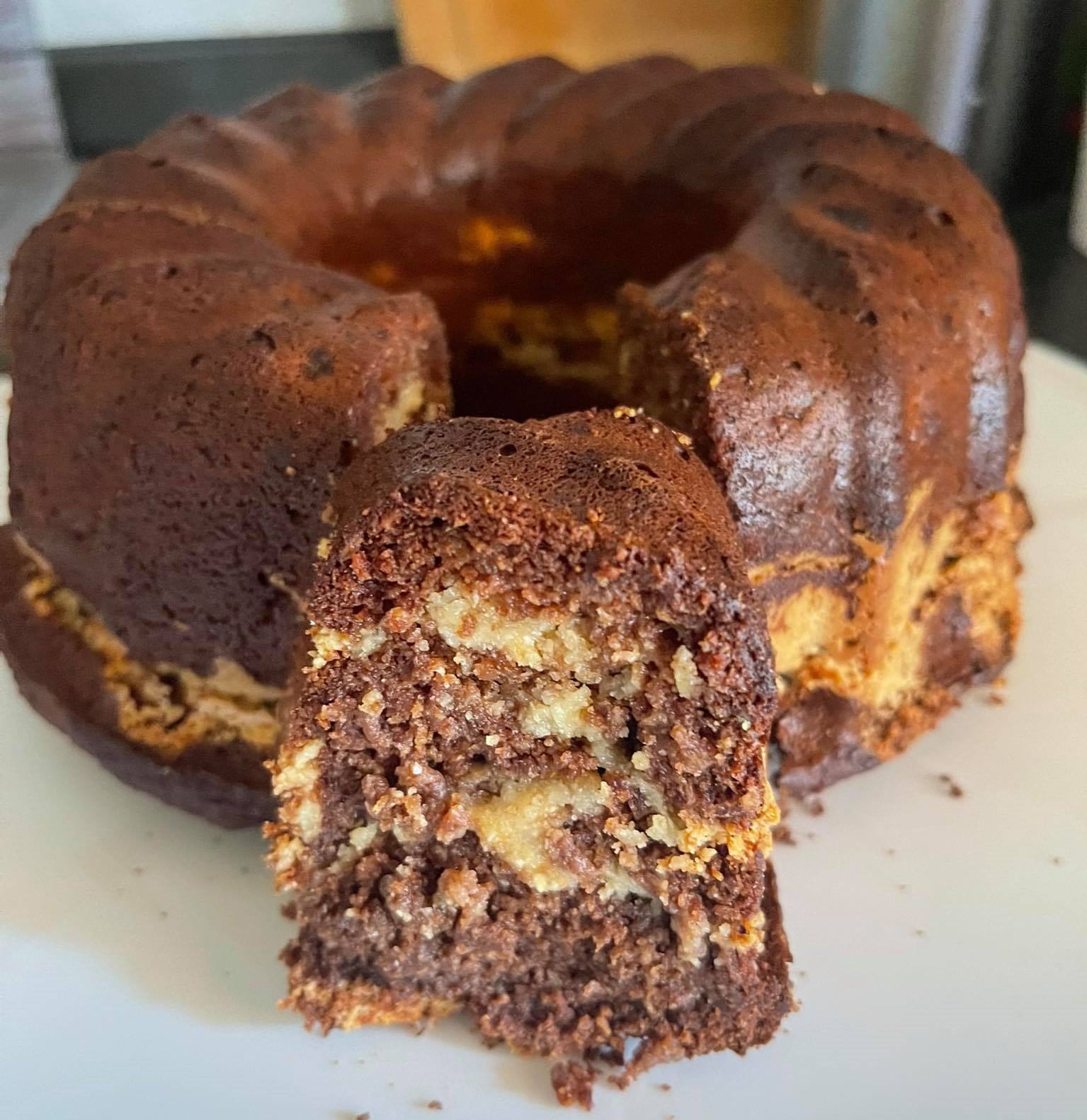 Ψήνουμε σε καλά προθερμασμένο φούρνο στους 180°C στον αέρα για περίπου 50 λεπτά ή μέχρι να βγαίνει καθαρό το μαχαίρι όταν το βυθίζουμε προσεκτικά στο κέντρο του κέικ. Βγάζουμε από το φούρνο, αφήνουμε 10-15 λεπτά να κρυώσει και ξεφορμάρουμε προσεκτικά.