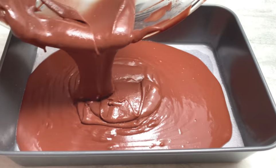 Λαδώνουμε ένα ταψί το στρώνουμε με χαρτί ψησίματος και αδειάζουμε μέσα το μείγμα σοκολάτας.