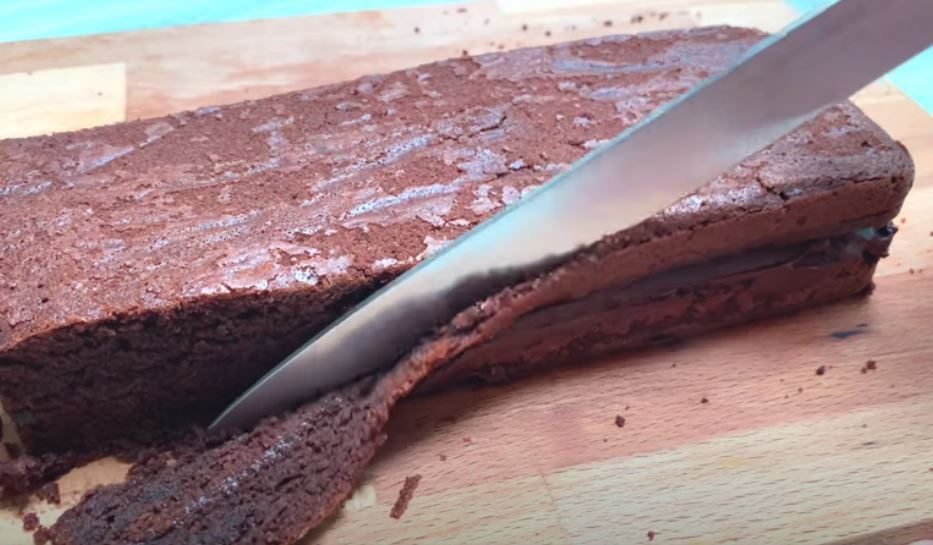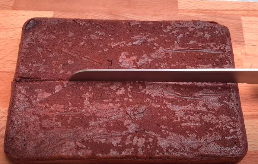 στον πάγκο μας ανάποδα και αφαιρούμε το χαρτί. Κόβουμε κάθετα το κέικ στην μέση