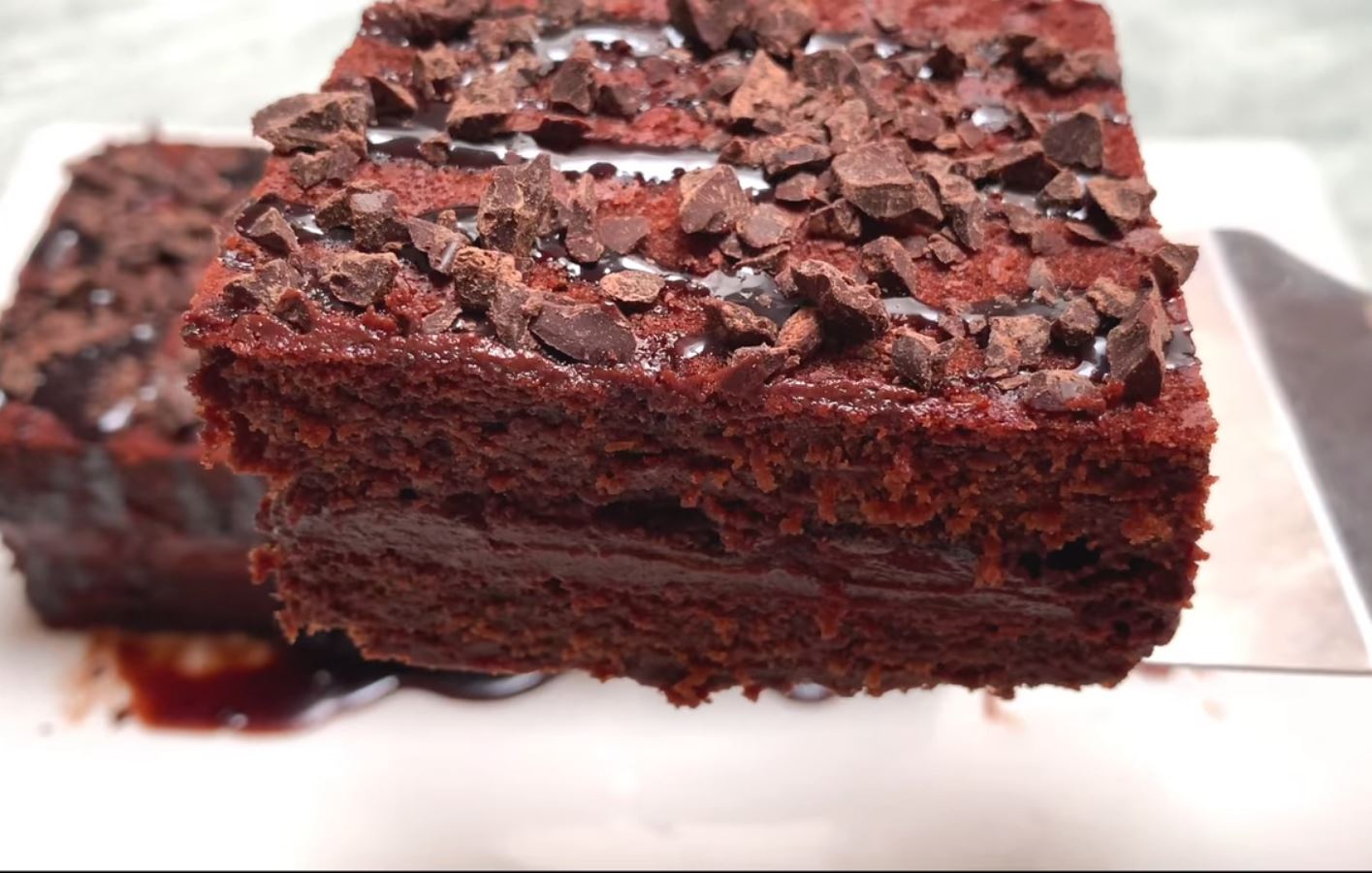 Λαδώνουμε ένα ταψί το στρώνουμε με χαρτί ψησίματος και αδειάζουμε μέσα το μείγμα σοκολάτας.