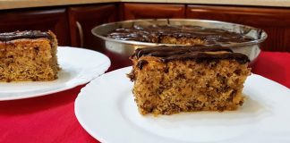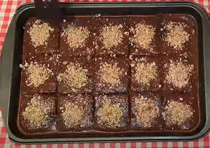 Βγάζουμε το κέικ απ τον φούρνο το κόβουμε κομμάτια και το περιχύνουμε με την υγρή σοκολάτα.