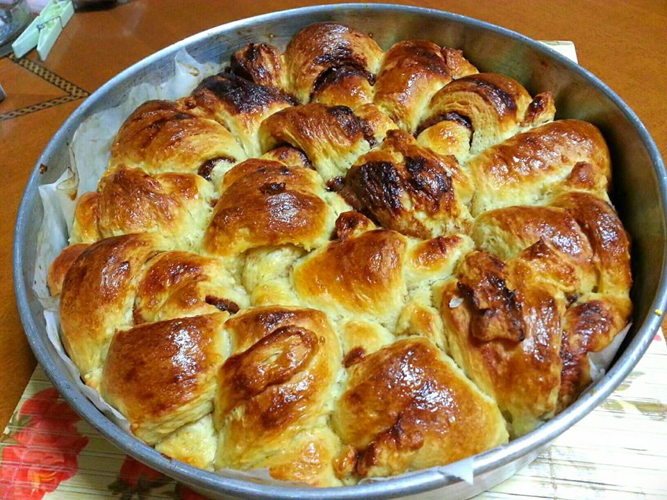 Αφού φουσκώσει η ζύμη την ανοίγουμε με τον πλάστη σε ένα μεγάλο στρογγυλό φύλλο πάχους περίπου ενός δαχτύλου. Απλώνουμε τη γέμιση της προτίμησής μας τριμμένη σοκολάτα μερέντα ή καστανή ζάχαρη με κανέλα Τυλίγουμε τη ζύμη σε ρολό και την κόβουμε σε φέτες. Τοποθετούμε τις φέτες κυκλικά σε ένα ταψί και τις αφήνουμε για άλλη μισή ώρα σε ζεστό μέρος για να φουσκώσουν ξανά καλά.