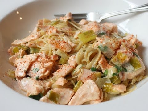 Βουτυρώνετε ένα ταψάκι ή ένα πυρίμαχο σκεύος και στρώνετε στη βάση τις πατάτες. Συνεχίζετε με τον σολομό, ρίχνετε από πάνω το σοταρισμένο πράσο, το σχοινόπρασο και περιχύνετε με την κρέμα γάλακτος.