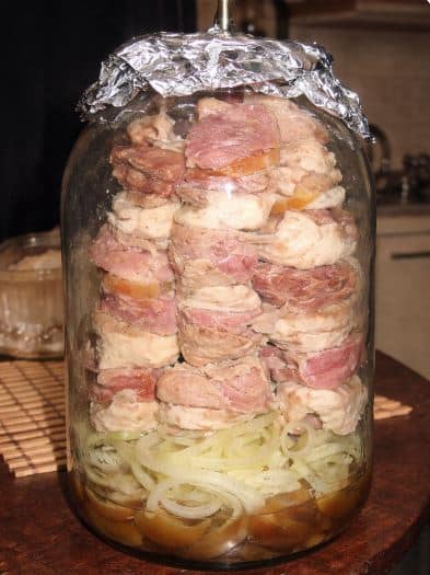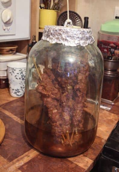 Στον πάτο ενός στεγνού και καθαρού γυάλινου βάζου (τριών λίτρων ή δύο μικρότερων) τοποθετούμε το κρεμμύδι που περίσσεψε, Βάζουμε όρθια 4 με 5 σουβλάκια σε κάθε βάζο και καλύπτουμε το στόμιο σφιχτά με αλουμινόχαρτο