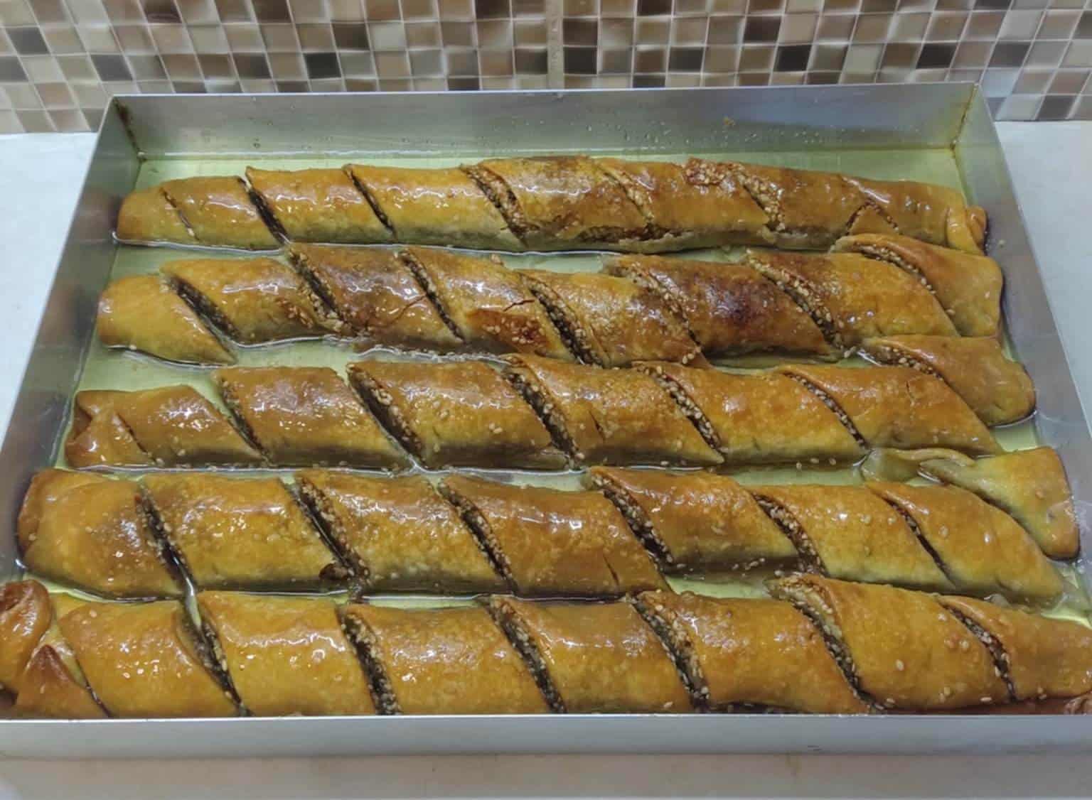 Βάζουμε το ρολό, σε λαδωμένο ταψί και λαδώνουμε επίσης όλα τα μπαστούνια και το βάζουμε στο φούρνο και ψήνουμε στους 180 βαθμούς αερα για 50 με 55 λεπτά με το που βγει από το φούρνο σιροπιάζουμε και το αφήνουμε για μισή ώρα να τραβήξει όλο το σιρόπι