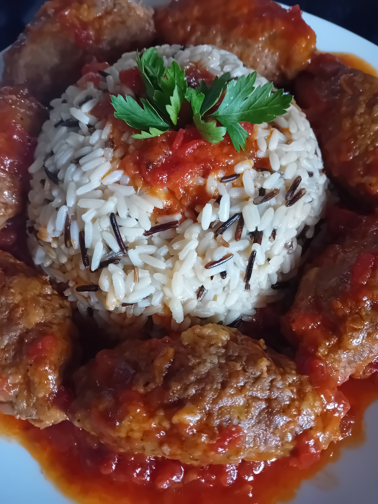 Σερβίρω τα ζεστά σουτζουκάκια διπλα στο άγριο ρύζι και περιχύνω με την ζεστή σάλτσα ντομάτας.