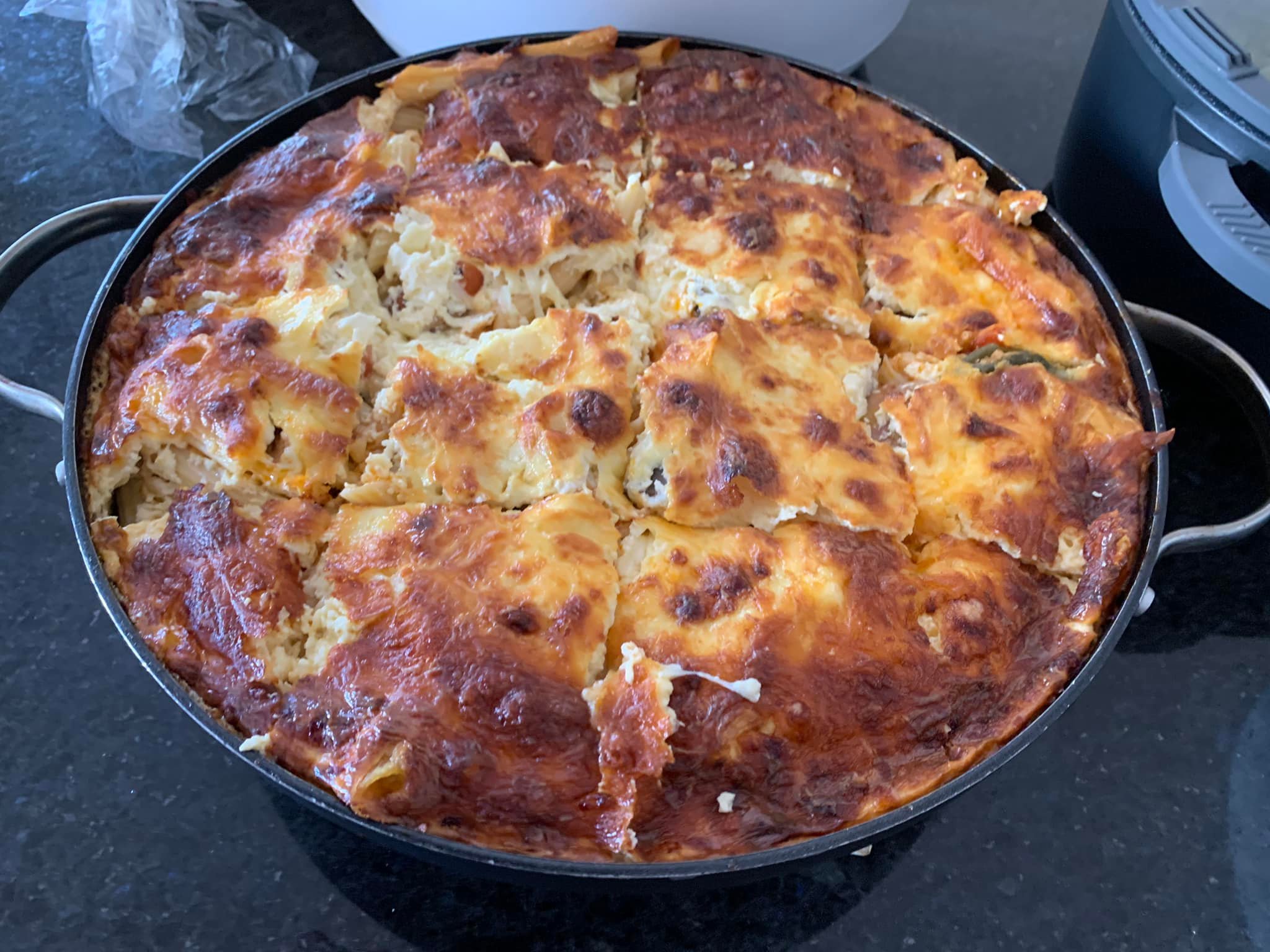 Χτυπάω τα αυγα προσθετω την κρεμα στα αυγα, το γαλα, τα ρίχνω στα μακαρόνια απο πανω τη μοτσαρελα που κράτησα.