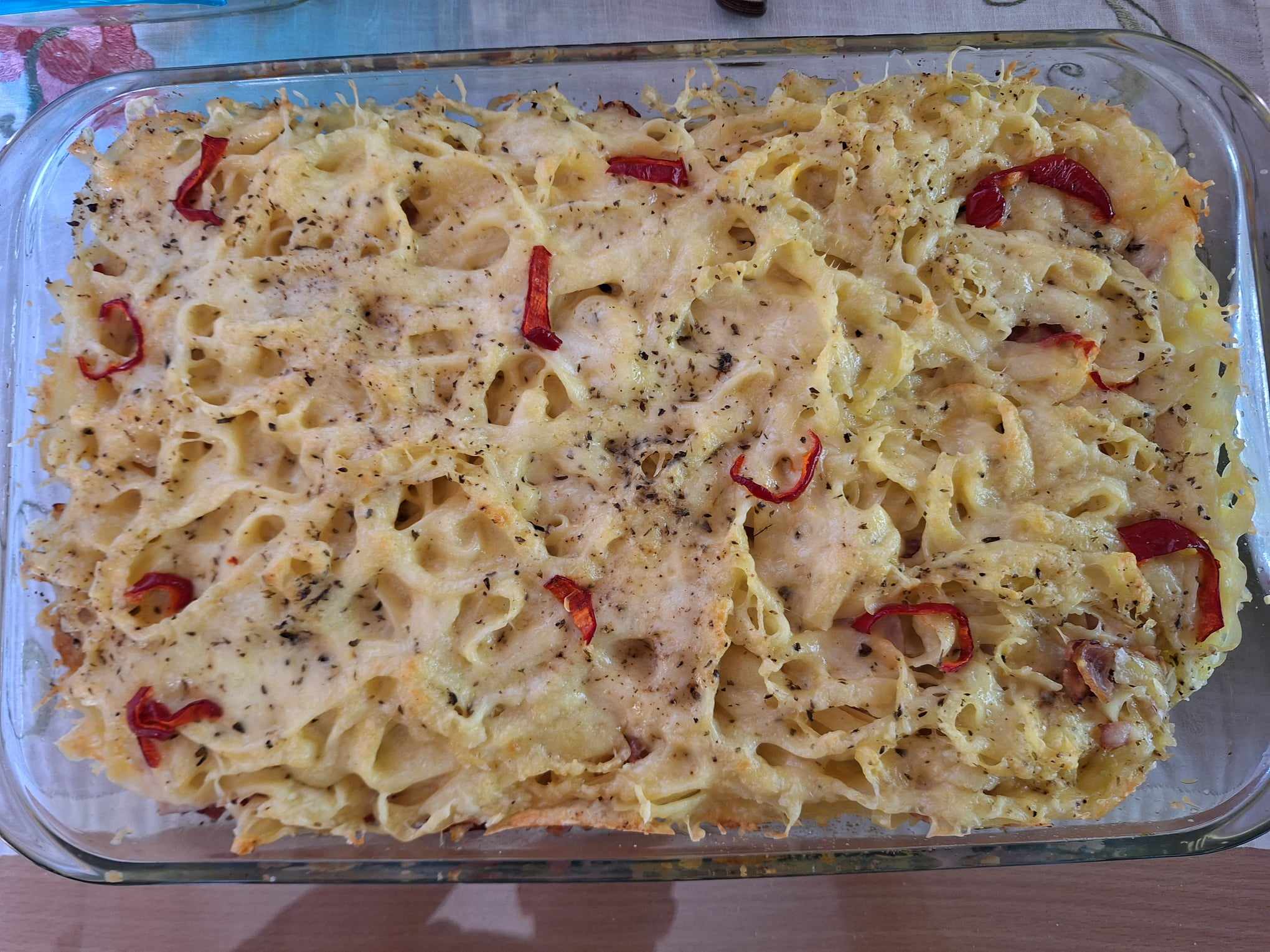 Ένα πλούσιο σουφλέ ζυμαρικών που λιώνει στο στόμα, με τραγανό μπέικον και τριμμένα τυριά που θα σε μαγέψουν