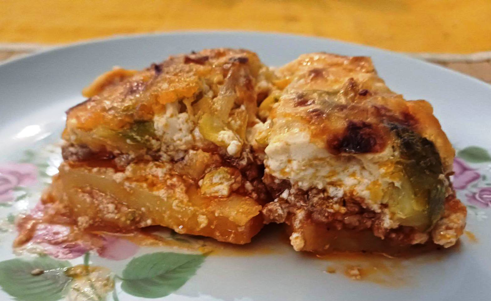 Τηγανίζουμε στρογγυλές φέτες πατάτας και τις απλώνουμε σε απορροφητικό χαρτί για να στραγγίξουν. Κάνουμε το ίδιο και για τα κολοκυθάκια. Για τη συνταγή, χρησιμοποιούμε κιμά μαγειρεμένο όπως για μακαρόνια.