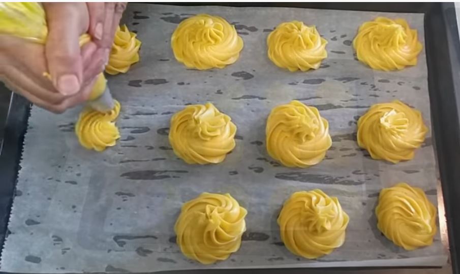 Την βάζουμε σε μια σακούλα ζαχαροπλαστικής με πριονωτο στομιο και σχηματίζουμε πάνω σε ένα ταψί στρωμένο με χαρτί ψησίματος μεγάλες ροζέτες