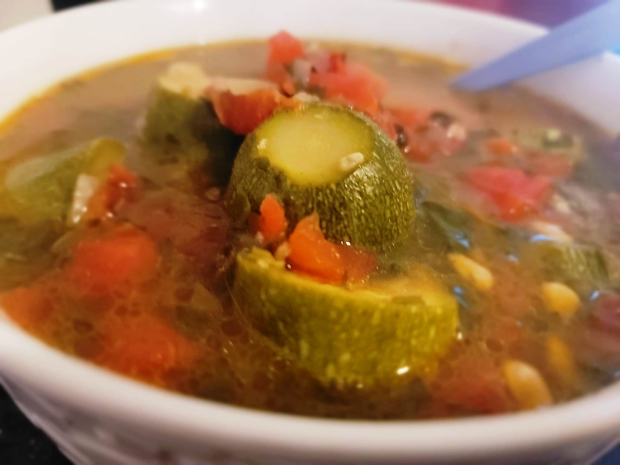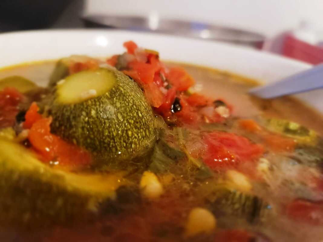 15 λεπτά αργότερα προσθέτω τις ντομάτες σε κύβους και τα κολοκυθάκια.