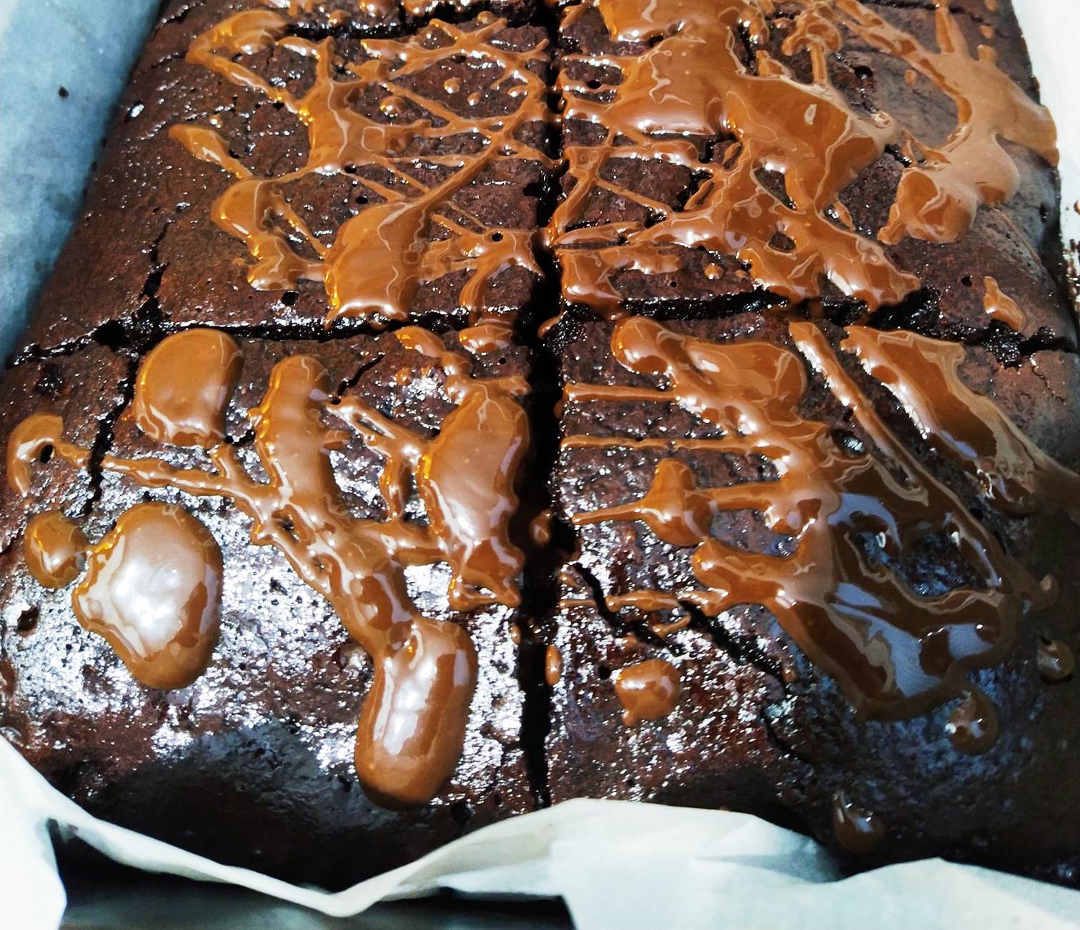 3. Κόβω το ελαφρώς ψυγμένο κέικ σε κομμάτια, σιρόπιασα παντού και το βάζω στο ψυγείο για περίπου 10 λεπτά. Το έβγαλα και ρίξαμε την λιωμένη μαύρη σοκολάτα στην κορυφή και το έβαλα ξανά στο ψυγείο.