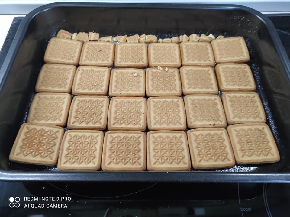 Αλείφουμε το βούτυρο σε ένα ταψί (το δικό μου είναι ορθογώνιο με διαστάσεις περίπου 35/25 εκατοστά). Τακτοποιήστε τα μπισκότα σφιχτά,