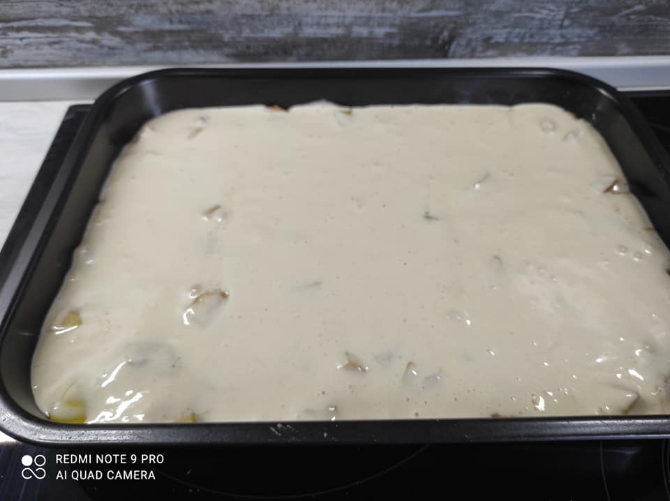 και το μέιγμα με τ αυγά χτυπημένα με τη ζάχαρη και το αλεύρι από πάνω.