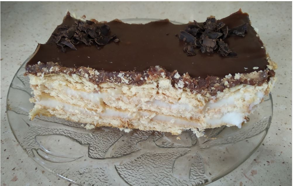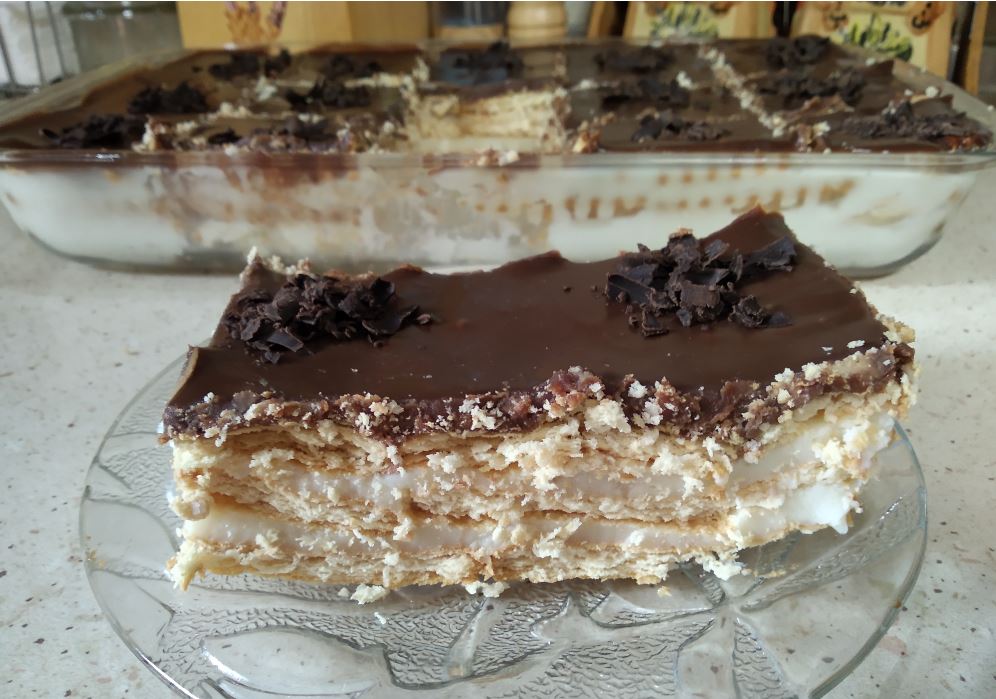 Βάζουμε σε ταψί ή πυρέξ(28×26)στον πάτο μια σειρά μπισκότα. Ρίχνω επάνω με προσοχή καυτή κρέμα. Ξανά μπισκότα – κρέμα – μπισκότα αφήνουμε να κρυώσει.