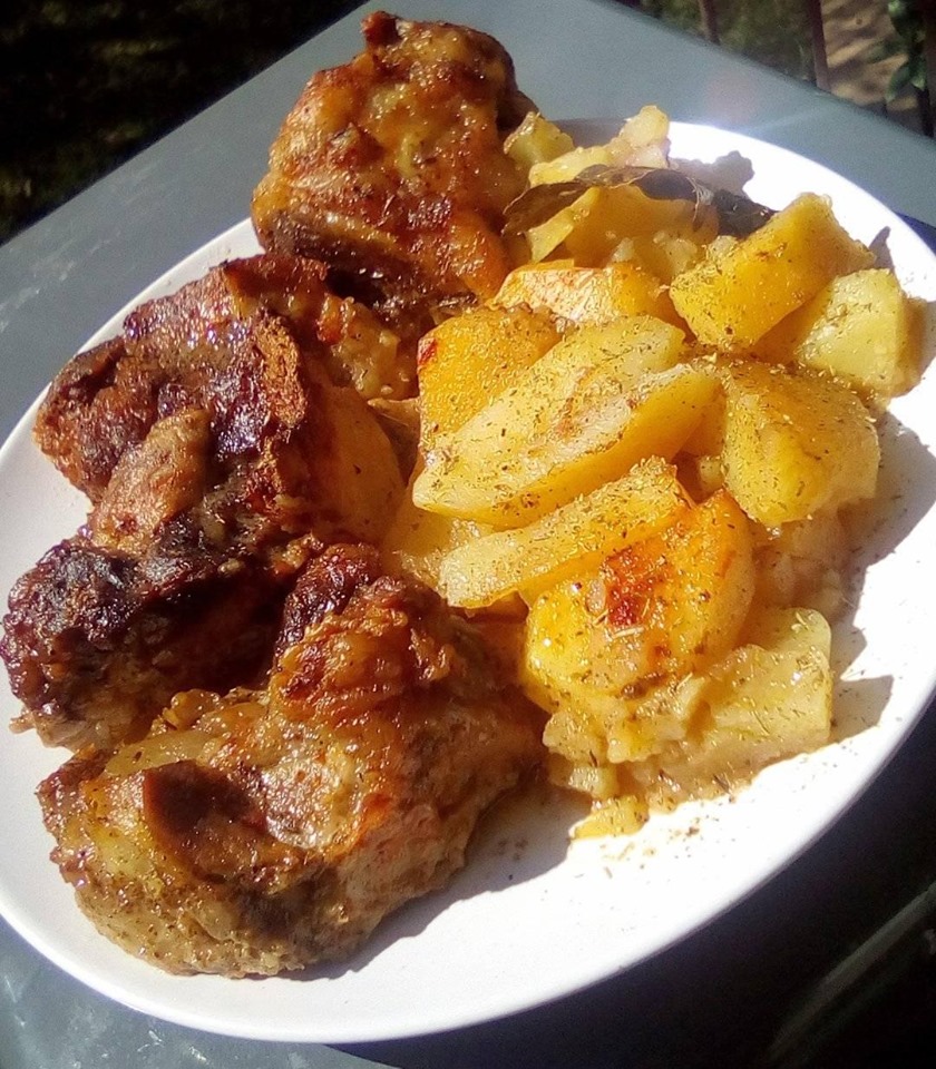Δίπλα στο κρέας τοποθετούμε της πατάτες ρίχνουμε τα μπαχαρικά ανακατεύουμε και ρίχνουμε το λάδι στην συνέχεια ανακατεύουμε και ρίχνουμε το πελτέ και πάλι ανακατεύουμε!