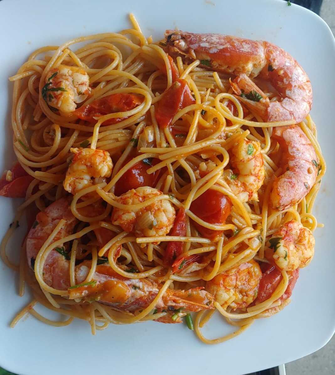 Αφήστε το να τσιγαριστεί για λίγα λεπτά, προσθέστε τα ντοματίνια και μετά από ένα λεπτό περίπου, προσθέστε περίπου την μισή σαλτσα γαρίδας. Μαγειρέψτε για μερικά λεπτά να ανακατευτούν όλα και στη συνέχεια προσθέστε τα σωματα γαρίδας και τον ψιλοκομμένο μαϊντανό.