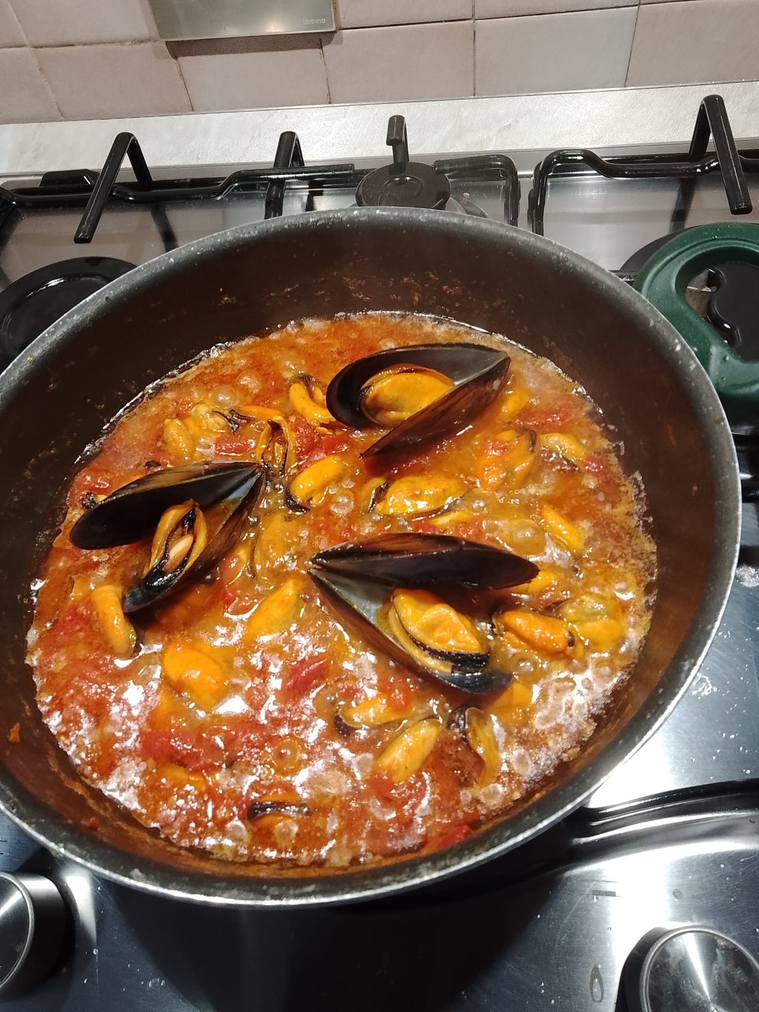 Προσθέστε επίσης μερικά καθαρισμένα μύδια , για να αρωματιστεί περισσότερο, και μετά από 1-2 λεπτά αφαιρέστε το σκόρδο και προσθέστε τον πουρέ ντομάτας μαζί με λίγο μαγειρικό υγρό