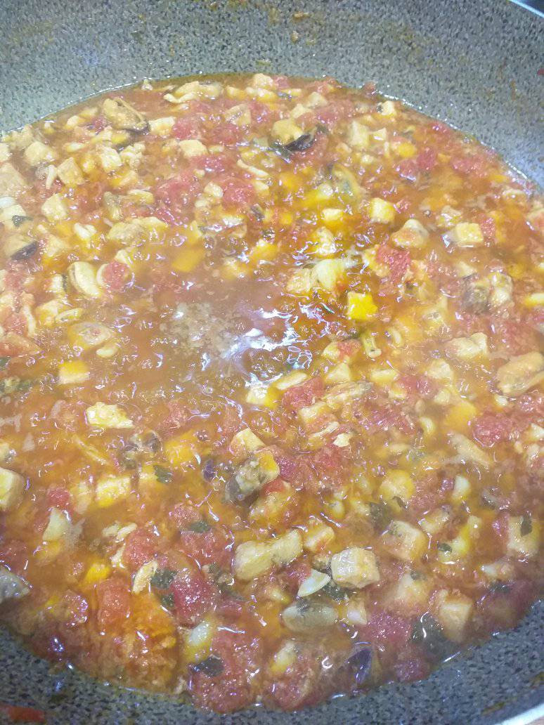 Καθαρίζουμε τις πιπεριές αφαιρώντας τους σπόρους και τα εσωτερικά νήματα και τις κόβουμε σε κύβους. Τις τηγανίζουμε και αυτές σε ελαιόλαδο και τις