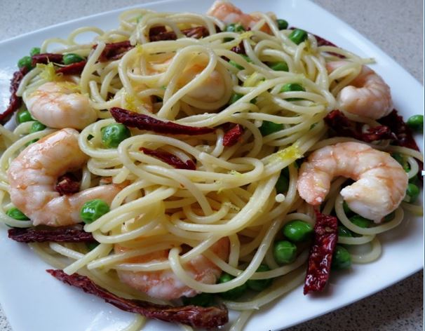 Σπαγγέτι με φρέσκo αρακά, λιαστές ντομάτες και γαρίδες