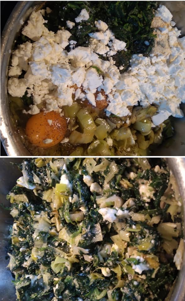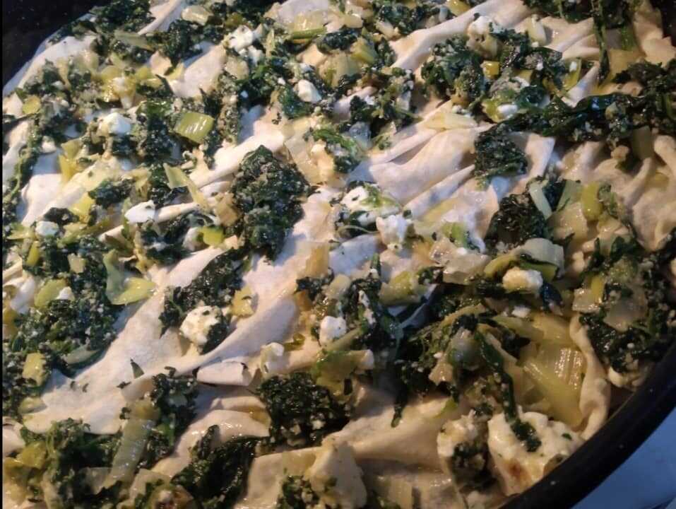 Λαδώνω ταψι 40 εκ. απλώνω 2 φυλλα λαδωνοτας τα και απλώνω το 1/3 της γεμισης, συνεχιζω φύλλο, λαδωμα γεμιση , φύλλο λάδωμα, γεμιση.