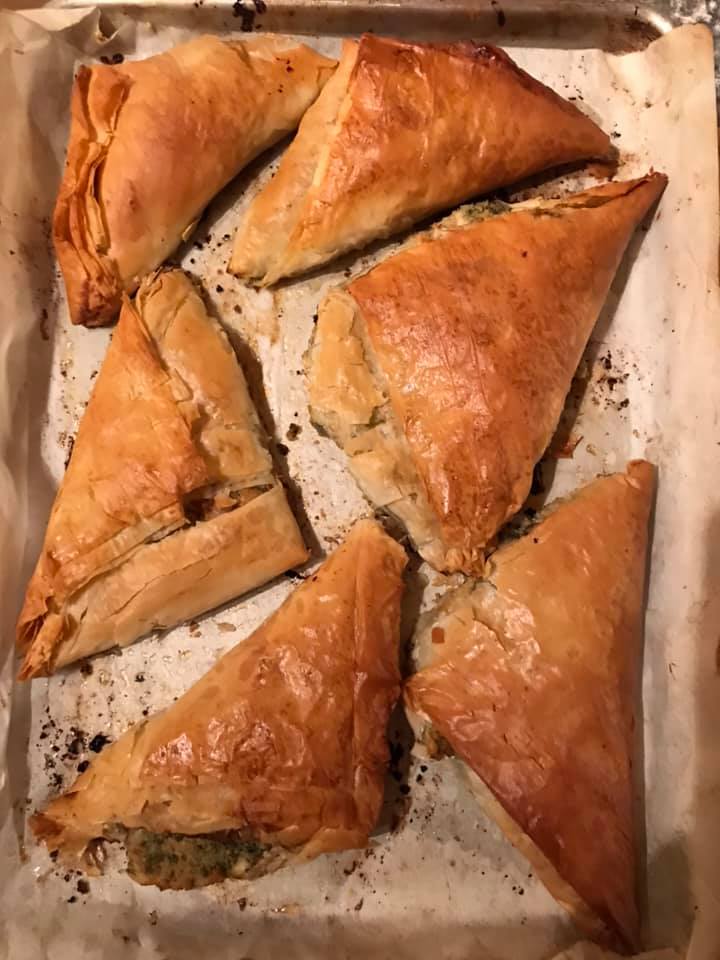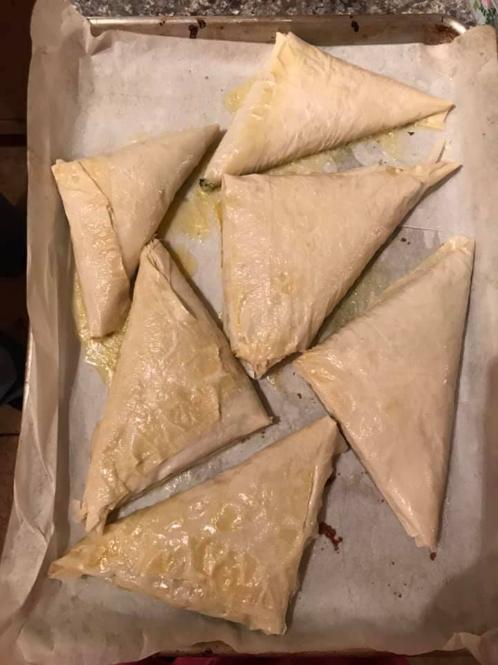 6. Λιπάνετε το κάτω μέρος ενός μεγάλου ταψιού, τοποθετήστε τα τρίγωνα