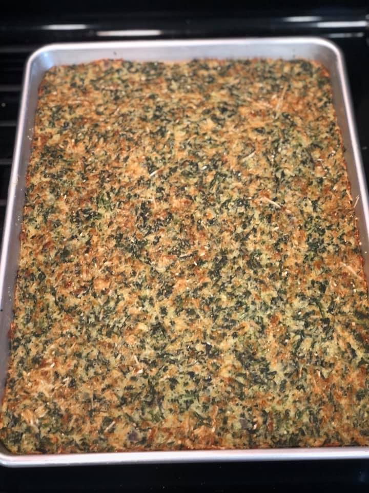 3 Μαγειρέψτε το σπανάκι στο φούρνο μικροκυμάτων για 3 λεπτά (ή μέχρι να ξεπαγώσει) Στραγγίστε το καλά και ανακατέψτε το σε ένα μεγάλο μπολ με το μείγμα του κρεμμυδιού, το αλεύρι, το αλάτι, το μπέικιν πάουντερ, τα αυγά, το γάλα, την παρμεζάνα και την φέτα.