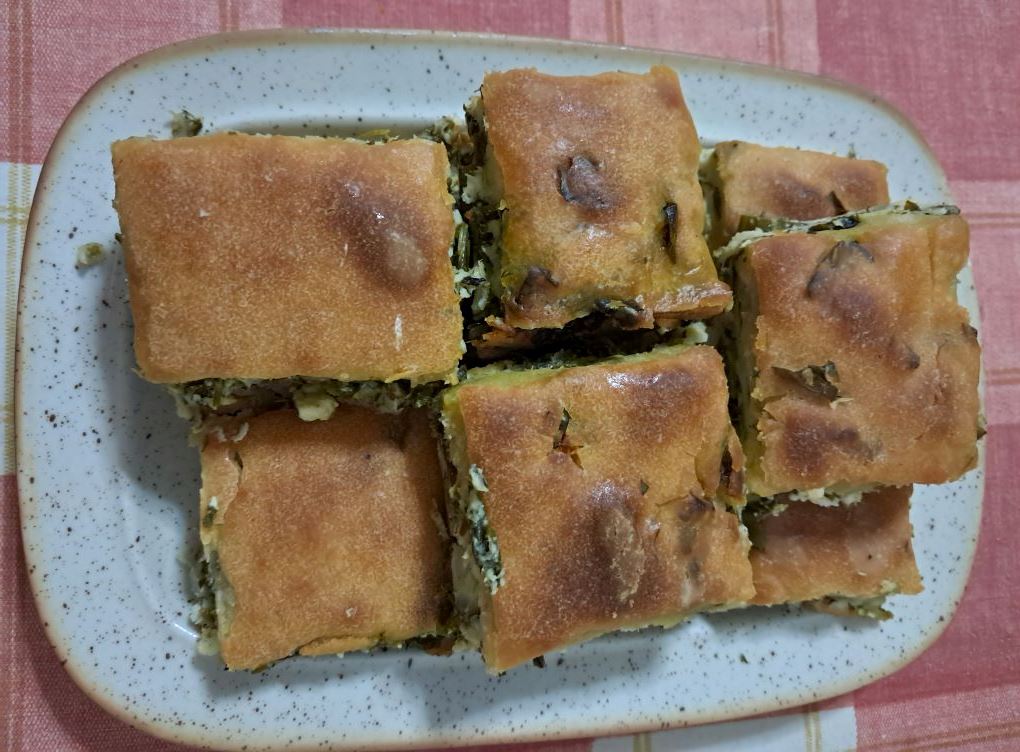 Απλώνουμε στο πάτο ένα πολύ λεπτό στρώμα από το χυλό. Βάζουμε από πάνω τη γέμιση που σε αυτήν και έχω προσθέσει μισό κιλό τριμμένη φέτα. Τέλος προσθέτουμε ένα ακόμα λεπτό στρώμα από το χυλό. Ψήνουμε στους 190 βαθμούς στις πάνω κάτω αντιστάσεις.