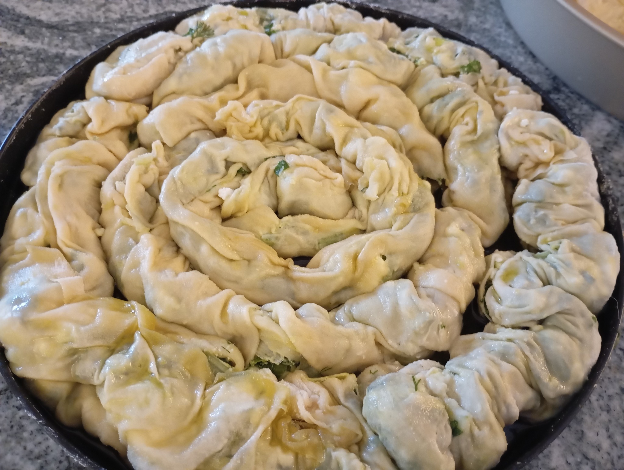 8. Συνεχίζω με τα υπόλοιπα κομμάτια ζύμης: ανοίγω, γεμίζω, τσαλακώνω και τα τοποθετώ περιμετρικά του πρώτου κομματιού, συνεχίζοντας τη σπείρα μέχρι να καλύψω όλο το ταψί. Φροντίζω να είναι όλα κολλημένα μεταξύ τους.