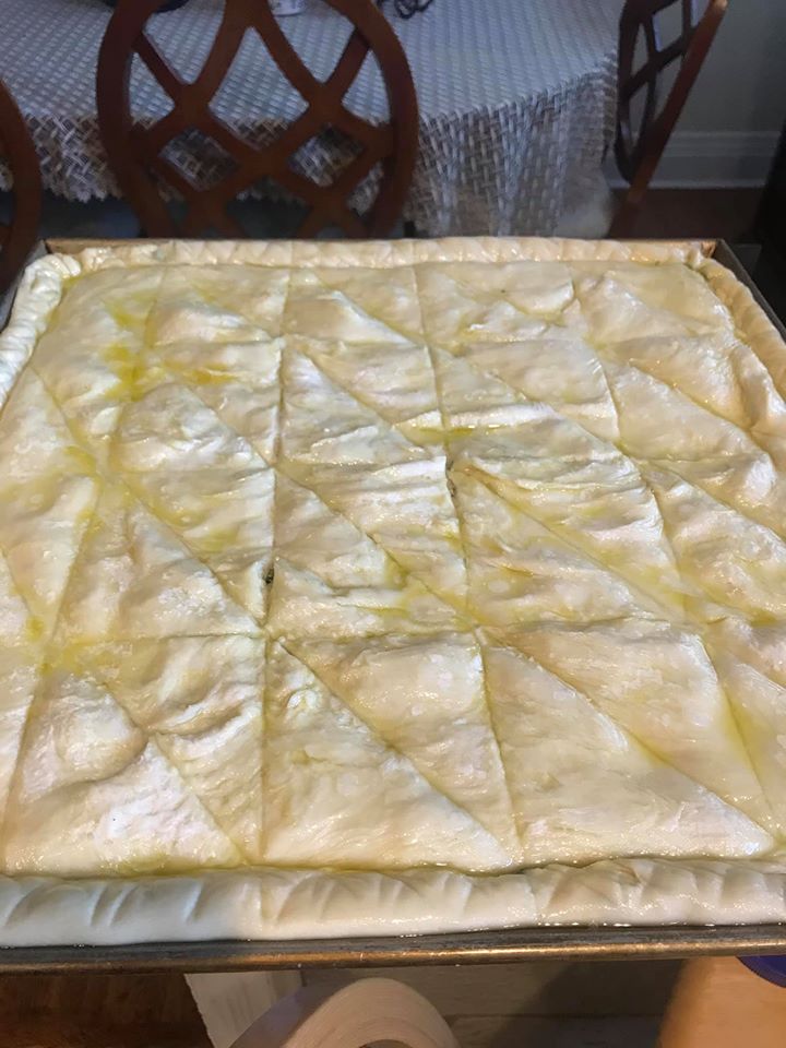 Αφού περάσει η ώρα ρίχνουμε αλεύρι στον πάγκο μας και ανοίγουμε το πρώτο φύλλο λίγο μεγαλύτερο από το ταψί μας ,λαδώνουνε το ταψί και το τοποθετούμε τη γέμιση το δεύτερο φύλλο και κάνουμε τον κοθρο γύρω .