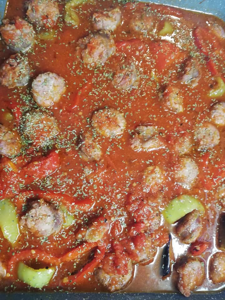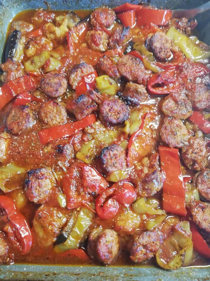 Σε ένα ταψάκι, τοποθετώ τις μελιτζάνες, απο πάνω βάζω τις πιπεριές και το λουκάνικο, ρίχνω και την σάλτσα, πασπαλίζω με ρίγανη