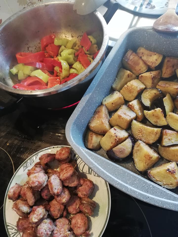 Σε μία κατσαρόλα σοτάρω πρώτα το λουκάνικο, το βγάζω, βάζω τις μελιτζάνες, μετά τις πιπεριές