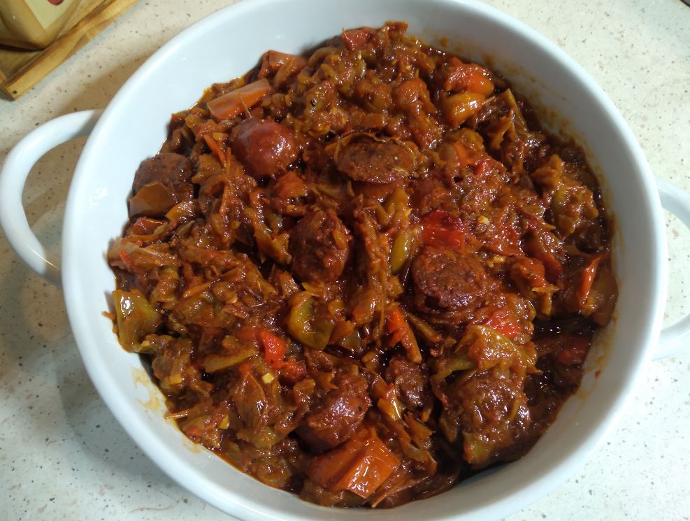 1)Κόβουμε τα λουκάνικα σε χοντρά κομμάτια.