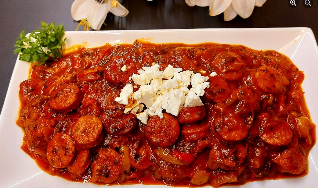 Τα τηγανισμένα χωριάτικα λουκάνικα δένουν τέλεια με τη σάλτσα από τις γλυκιές πιπεριές και τη ντομάτα.