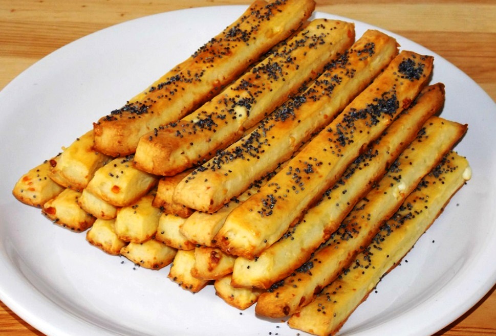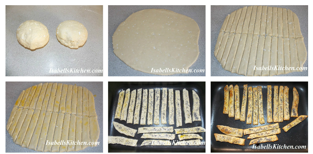 Τοποθετήστε ένα κομμάτι ζύμης πάνω στην αλευρωμένη επιφάνεια εργασίας και ανοιξτε την σε ένα φύλλο πάχους 4-5 mm. Χρησιμοποιήστε ένα κοφτερό μαχαίρι για να κόψετε το φύλλο της ζύμης σε μισά, κατά μήκος, και στη συνέχεια κόψτε σε λωρίδες 1,5 cm. Βουρτσίστε με το αυγό και μεταφέρετε σε ένα αντικολλητικό ταψί. Πασπαλίστε με παπαρουνόσπορους (ή σουσάμι) και τοποθετήστε το ταψί στον προθερμασμένο φούρνο.