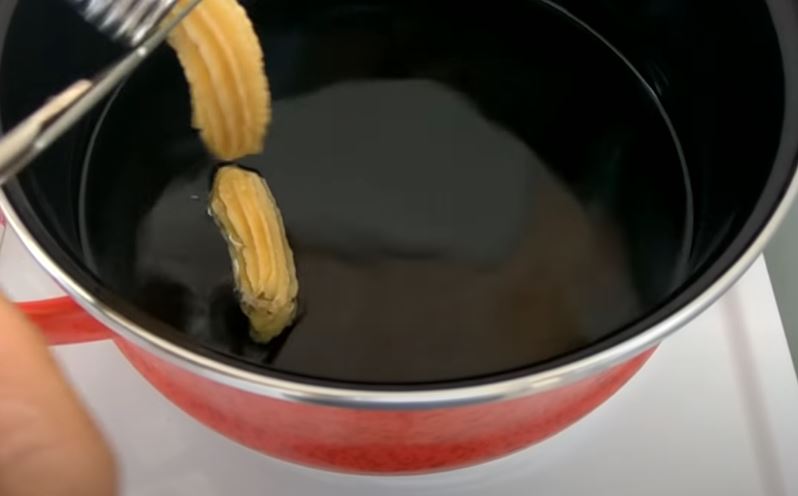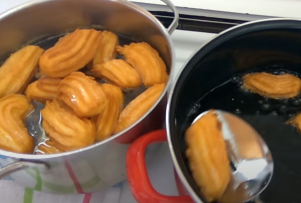 Πιέστε τον κορνε να βγαίνουν τα τουλουμπακια και να πέφτουν στο χλιαρό λάδι. Χρειάζεται ένα μεγάλο τηγάνι.
