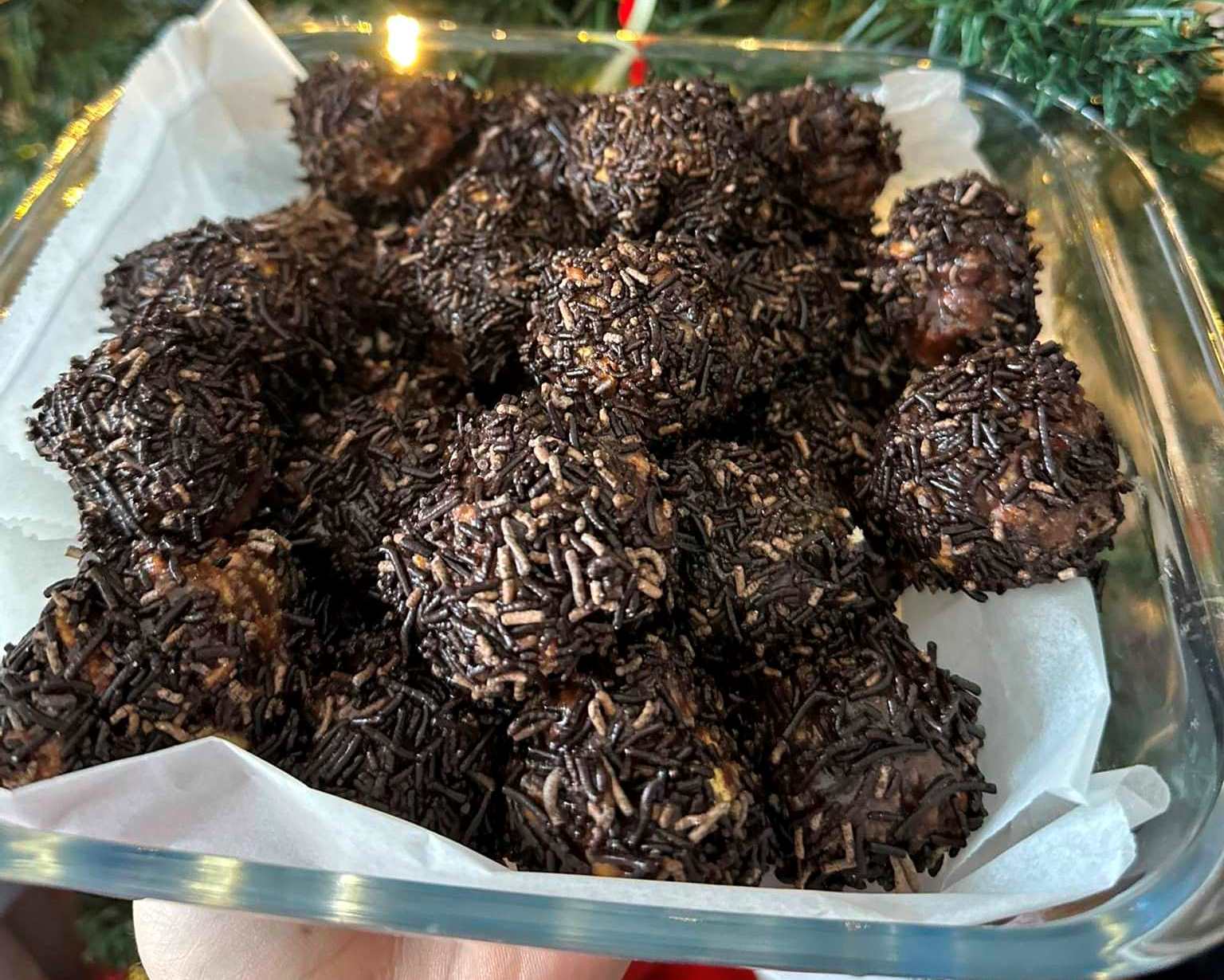 Πλάθουμε μικρά, στρογγυλά τρουφάκια και τα περνάμε στην τρούφα.