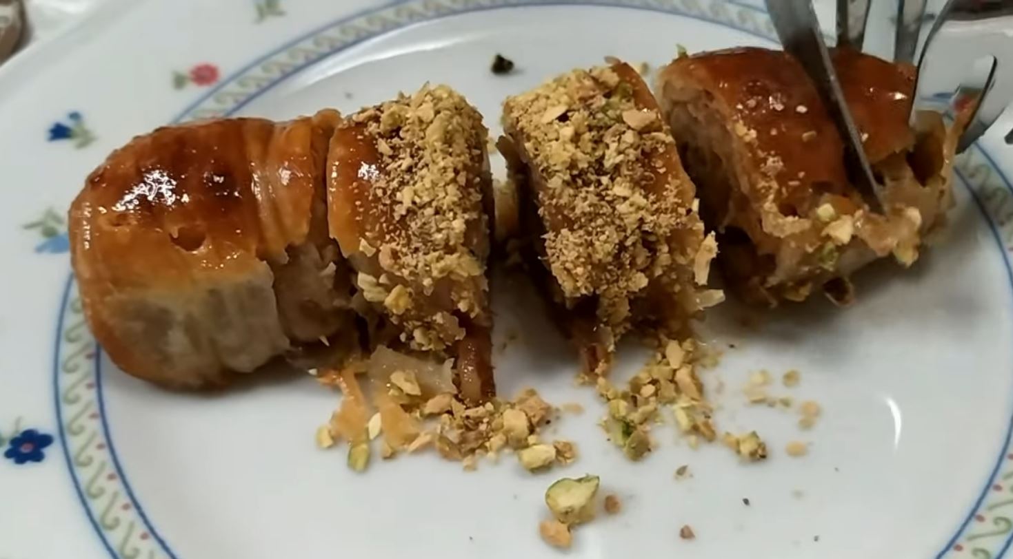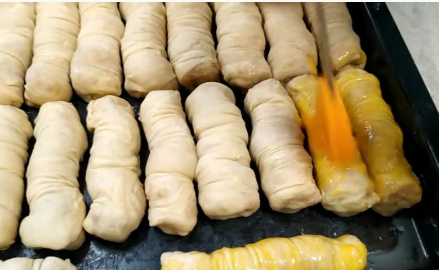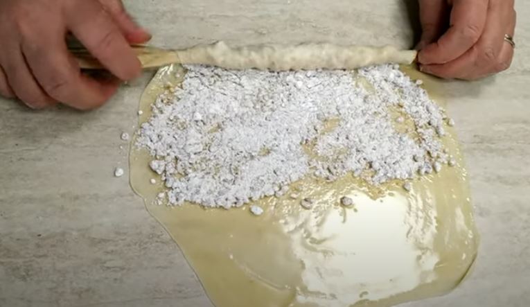 Αλείφουμε με βούτυρο (250 γρ) απλώνουμε τη γέμιση να καλύψει περίπου το μισό φύλλο και στη συνέχεια τυλίγουμε με την βοήθεια ενός πλάστη, τα σουρώνουμε στις δύο άκρες προς το κέντρο και το αφαιρούμε τον πλάστη.