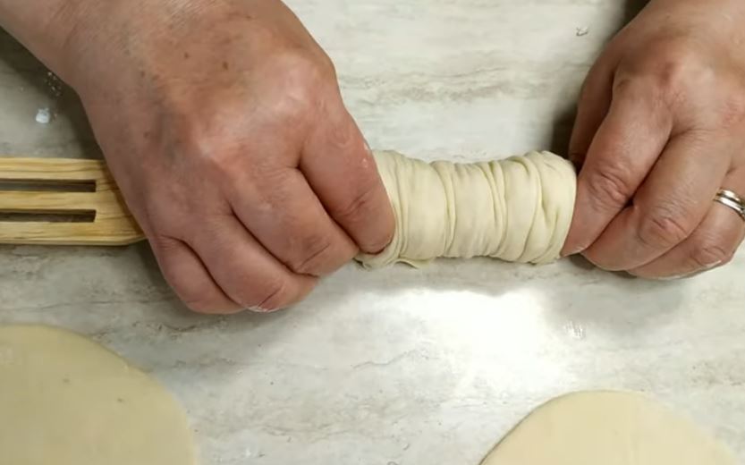 Παίρνουμε ένα-ένα το μπαλάκι και με ένα πλάστη θα ανοίγουμε φύλλο περίπου σε μία διάμετρο 20 με 22 cm.