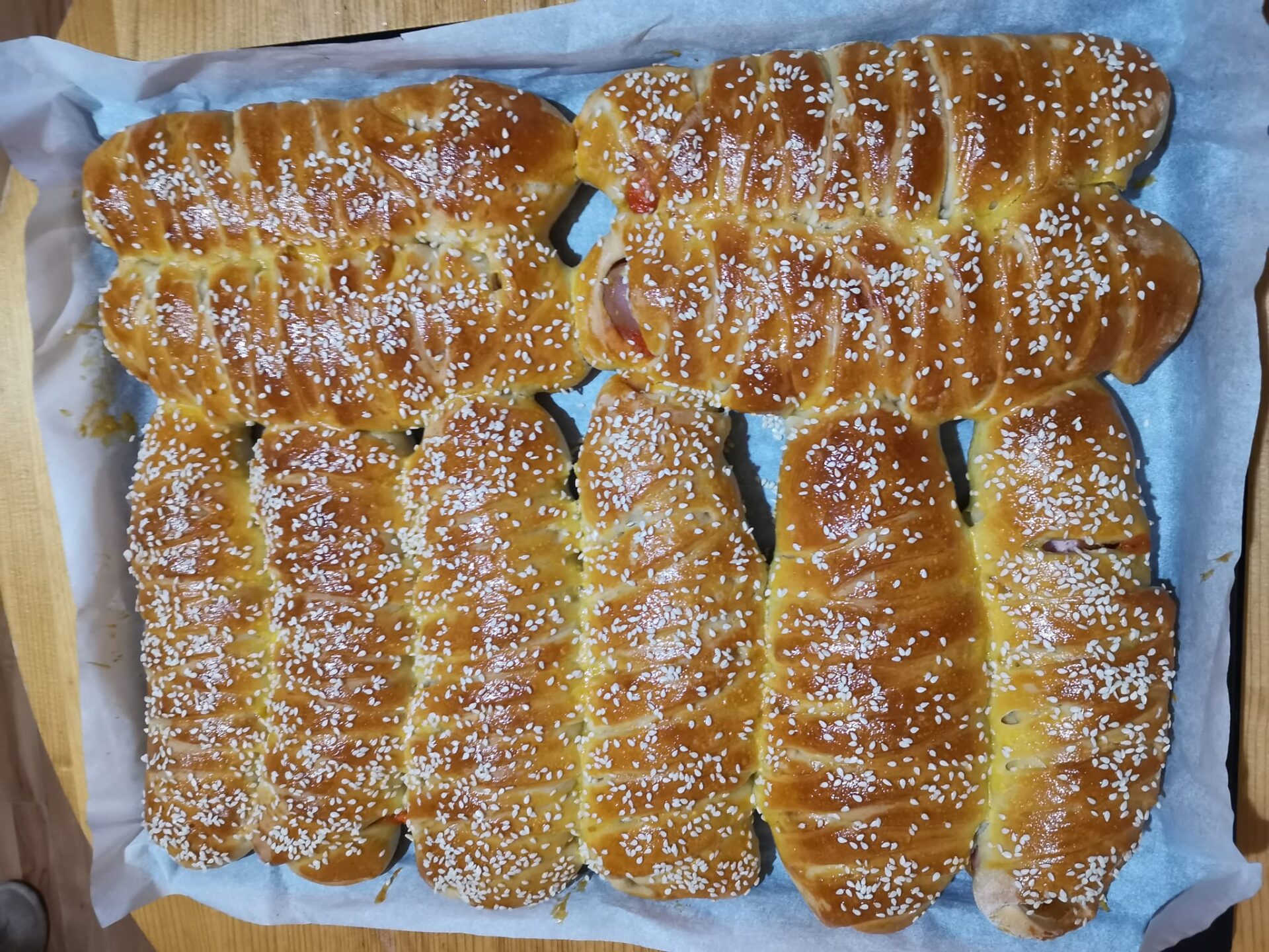 Ανοίγουμε κάθε μπάλα σε οβάλ σχήμα, αλείφουμε με ένα μείγμα σαλτσα ντομάτας, μουστάρδας και μαγιονέζας, βάζουμε ενα λουκάνικο στην μέση και μετα κάνουμε χαρακιες και στις 2 πλευρές εκατερωθεν του λουκάνικου και τυλίγουμε εναλλάξ σαν πλέξη. Στη συνέχεια το αφήνουμε να φουσκώσει να διπλασιάσει τον όγκο του, αλείφουμε με ένα κρόκο, πασπαλίζουμε με σουσάμι και ψήνουμε στα 180 γρ.. Μέχρι να είναι έτοιμο