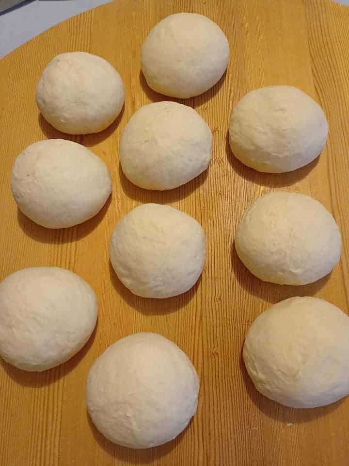 Αλευρώστε έναν καθαρό πάγκο εργασίας και χωρίστε τη ζύμη σε 10 ίσα μέρη.